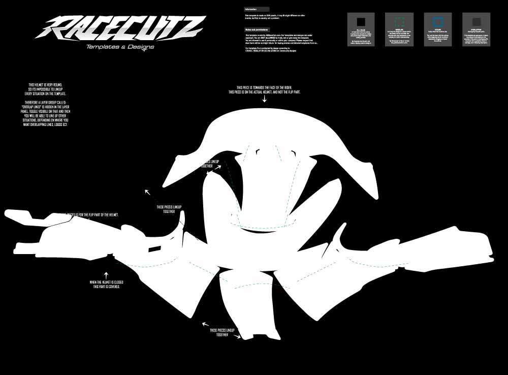 This template is made with the purpose of a full coverage template for a more complete look. This template will hide most of the helmet color, but will be slight harder to install and require a bit more heating.